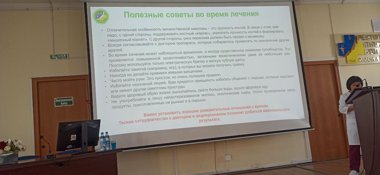 С лекцией о заболевании множественная миелома продолжила школу врач-гематолог, заслуженный врач Республики Бурятия, главный внештатный гематолог Министерства здравоохранения Республики Бурятия Очирова Оксана Ешиевна. Оксана Ешиевна рассказала о симптомах множественной миеломы, лабораторных и инструментальных диагностических исследованиях, показаниях к началу терапии и определении стратегии лечения, об организации оказания медицинской помощи в регионе.