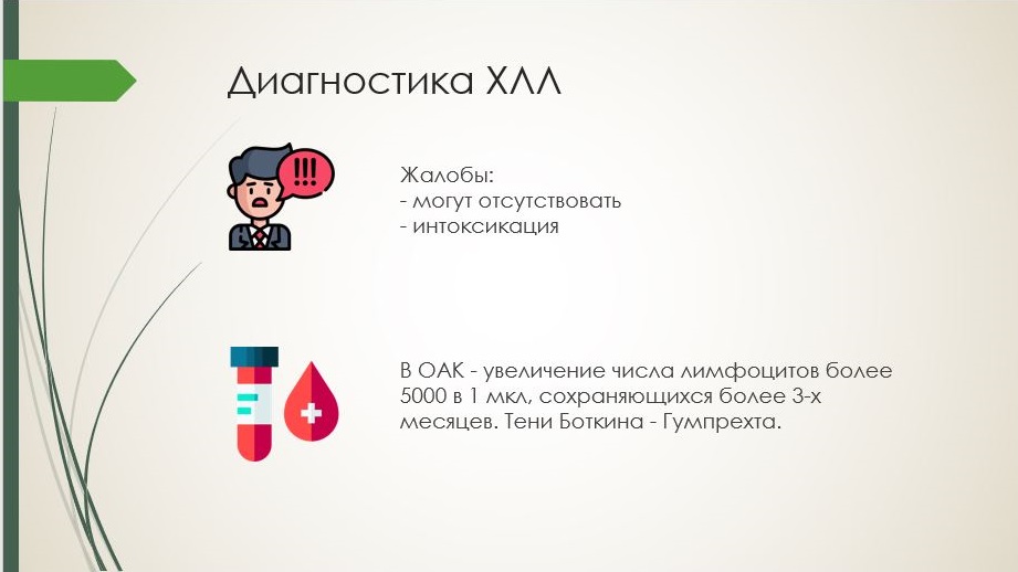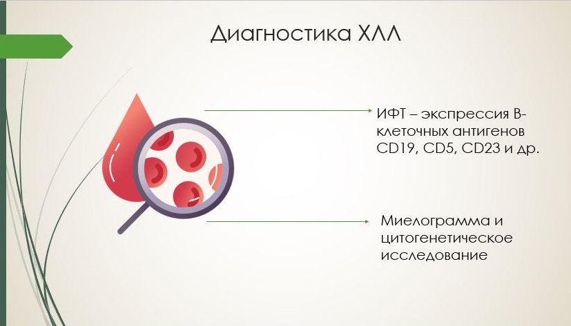 «Врач может заподозрить хронический лимфолейкоз, опираясь на Ваши жалобы и обнаружив соответствующие симптомы при осмотре. В этом случае будет необходимо пройти ряд обследований, включая анализ крови и костного мозга. При ХЛЛ самый важный анализ – это анализ крови, без него диагноз не ставится. В анализе крови выявляется увеличение числа лимфоцитов. Диагноз обязательно подтверждается специальным исследованием – иммунофенотипированием лимфоцитов. Могут понадобиться и другие уточняющие диагноз исследования» - отметила Анастасия Васильевна.