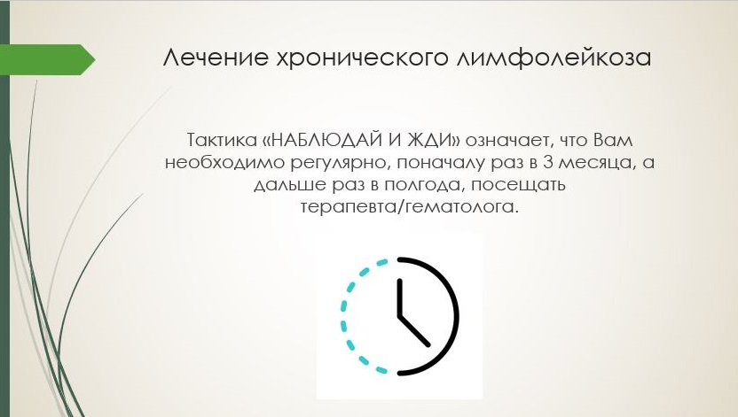 «К сожалению, на сегодняшний день хронический лимфолейкоз неизлечим. Однако у некоторых пациентов необходимость в лечении не возникает никогда – хронический лимфолейкоз может оставаться в стабильном состоянии в течение многих лет и даже десятилетий. Но, если имеются четкие признаки прогрессирования заболевания – устойчивый рост лимфоцитоза, увеличение лимфатических узлов, селезенки, появление анемии и тромбоцитопении, врач предложит определенный курс лечения. Выбирая лечение, доктор учитывает состояние болезни (клиническую картину и прогностические факторы); состояние пациента (возраст, сопутствующие заболевания); какое лечение проводилось раньше, когда наступил рецидив. В результате у большинства пациентов заболевание удается эффективно контролировать современными лекарствами» - завершая доклад сообщила лектор.