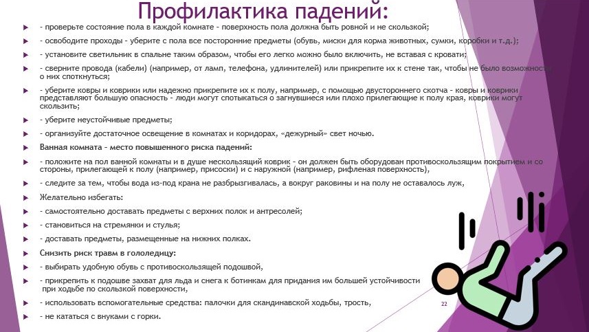 Анастасия Васильевна отметила, что лечение множественной миеломы длительное. Обратила внимание слушателей на важность профилактики падений в домашних условиях, на улице, в зданиях и сооружениях: