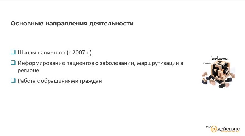 Далее с докладом «ВООГ «Содействие» в Пермском крае» выступили Намитова С.А., региональный представитель ВООГ «Содействие» в Пермском крае, Скворцова Е.И., волонтер ВООГ «Содействие» в Пермском крае. Была представлена информация о деятельности в Пермском крае, что волнует организацию при работе в регионе, о количестве обращений граждан, а также и возможностях для пациентов с множественной миеломой и их родственников.