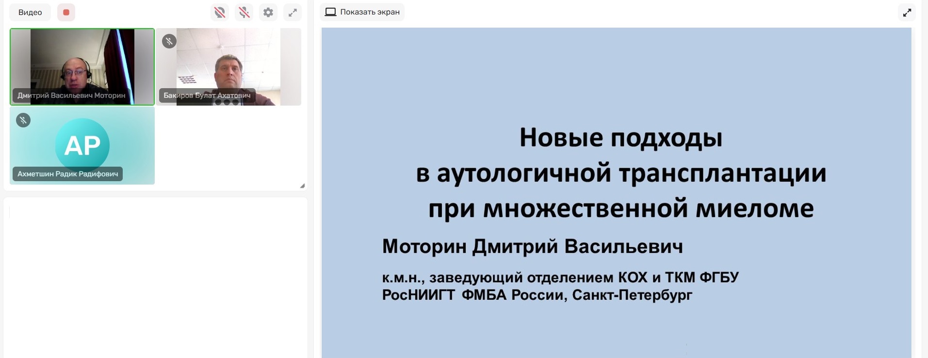 Лектор описал процессы при ТКМ, оборудование и используемые препараты. Более подробно донес информацию про сопроводительную терапию, планы и использование дыхательных тренажеров. И в заключение рассказал о перспективах ТКМ в России.