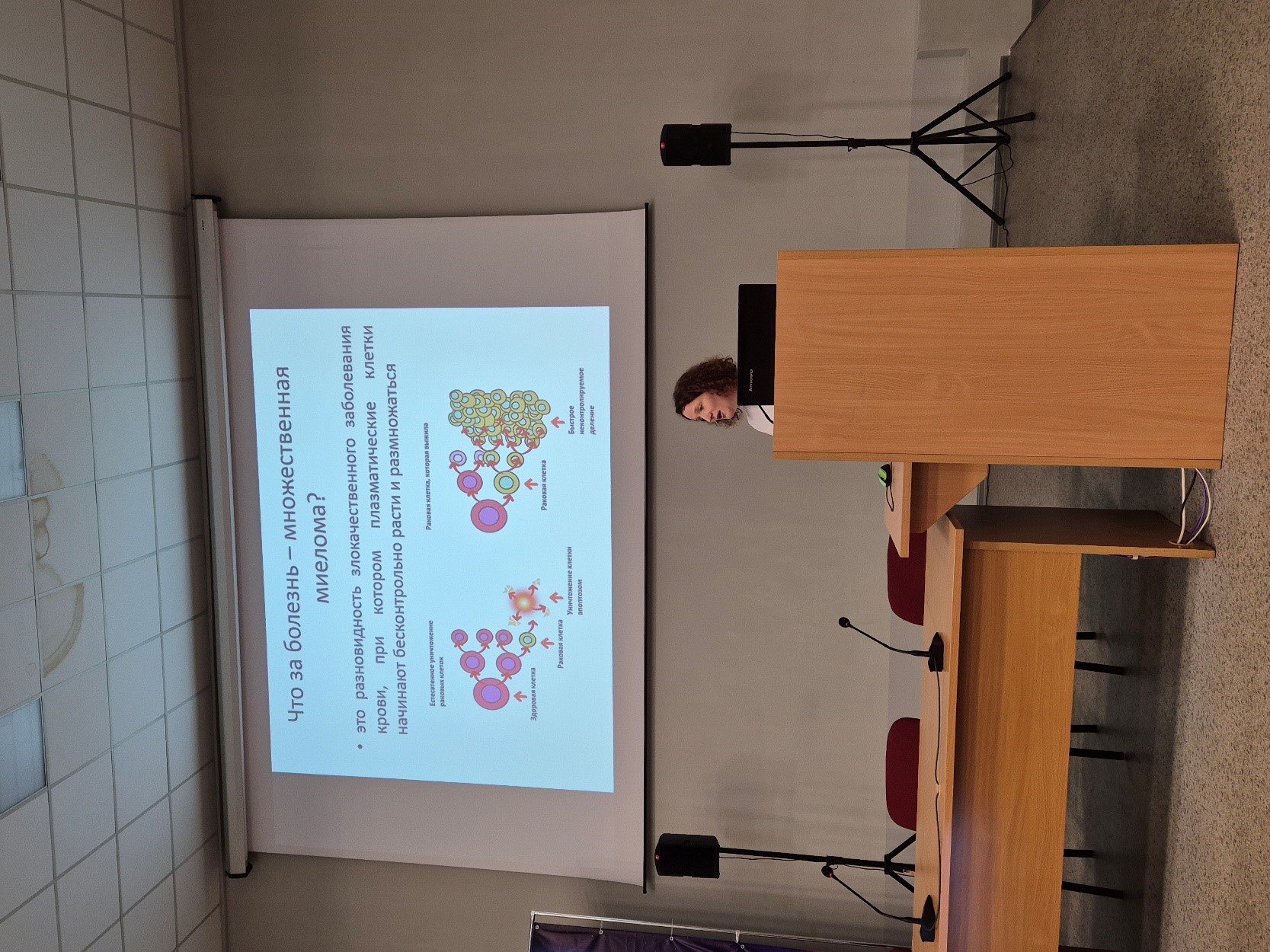 С докладом «Множественная миелома - просто о сложном» выступил Гарифуллин Андрей Дамирович, заведующий клиническим отделением гематологии, химиотерапии и трансплантации костного мозга с блоком интенсивной терапии и дневным стационаром клиники ФГБУ РосНИИГТ ФМБА России, к.м.н., врач-гематолог высшей категории. В простой и доступной для пациентов форме, Андрей Дамирович рассказал о заболевании множественная миелома, о симптомах, диагностике и лечении заболевания. Также пояснил о необходимости строгого соблюдения всех рекомендаций лечащего врача и иметь при себе готовый список вопросов при посещении гематолога.
