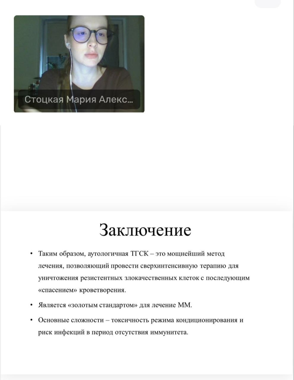 С докладом «Множественная миелома: аутологичная трансплантация гемопоэтических стволовых клеток (ауто-ТГСК), образ жизни после трансплантации» выступила Стоцкая М.А., врач-гематолог ГУ «Коми республиканский клинический онкологический диспансер». Лектор осветила вопросы, что такое аутологичная трансплантация гемопоэтических стволовых клеток при множественной миеломе, показания для ауто-ТГСК, методика проведения, что ждут врачи от данного метода лечения. А также о физической активности пациентов с множественной миеломой, питании, работе и социальной жизни, вакцинации после трансплантации.