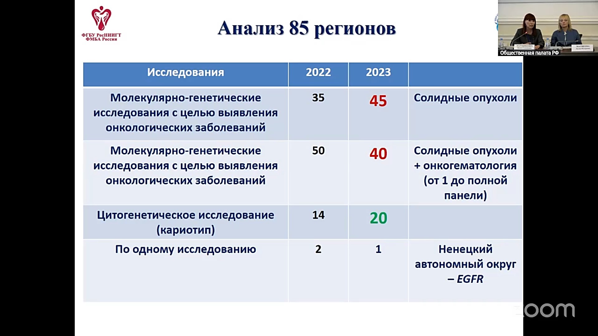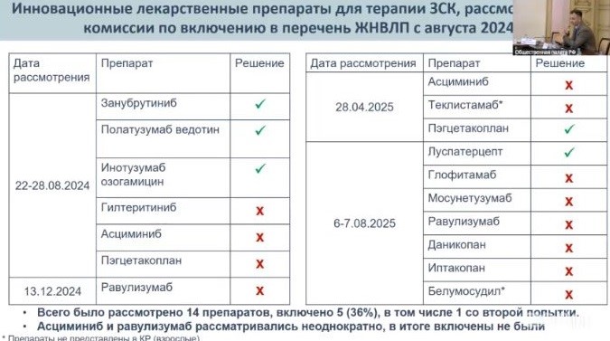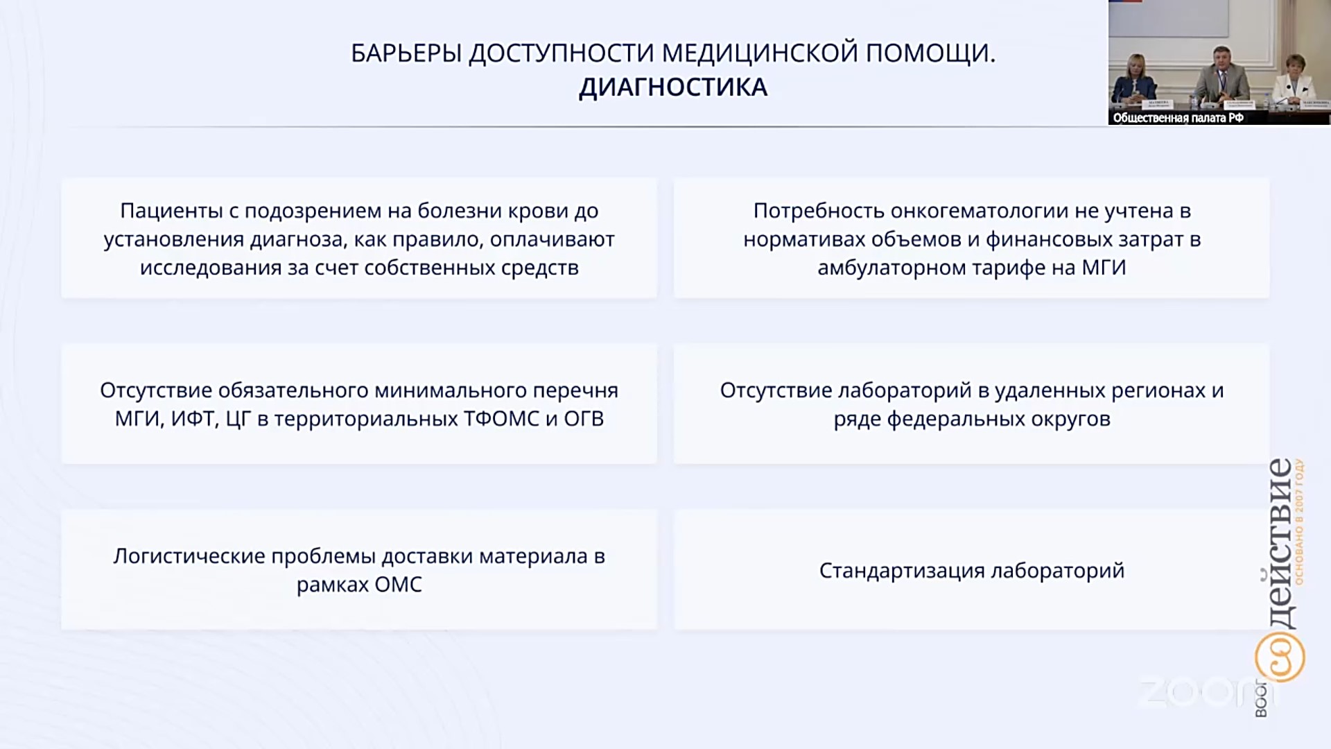 В докладе было отмечено, что доступность для граждан, страдающих онкогематологическими заболеваниями, жизненно необходимых, а для многих жизнеспасающих, инновационных лекарственных препаратов находится на недостаточном уровне. Согласно анализу структуры лекарственных закупок за 2024 год, в регионах прослеживается неравномерность затрат на инновационную терапию, заметен дефицит как на федеральном, так и на региональном уровнях. С августа 2024 г. Комиссией Министерства здравоохранения Российской Федерации по формированию перечней лекарственных препаратов для медицинского применения и минимального ассортимента лекарственных препаратов, необходимых для оказания медицинской помощи из 14 рассмотренных лекарственных препаратов включено 5, в том числе 1 со второй попытки.