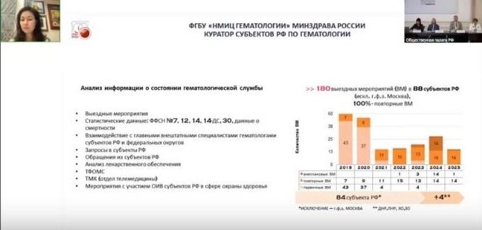 Было отмечено, что ФГБУ «НМИЦ гематологии» Минздрава России организует выездные мероприятия в субъекты РФ, которые носят комплексный характер и направлены на всесторонний анализ системы оказания помощи по профилю «гематология». Важным аспектом выездных мероприятий является обеспечение взаимодействия с медицинскими организациями всех субъектов РФ, где оказывают медицинскую помощь по профилю «гематология» (взрослым с заболеваниями системы крови), осуществляется экспертное сопровождение выполнения задач по направлениям организационно-методического руководства.