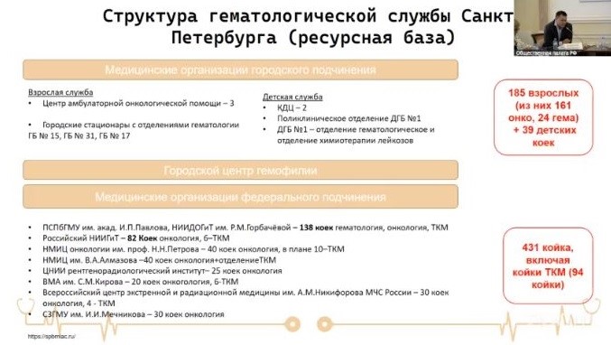 Докладчик рассказал о динамике ключевых показателей региональной программы Санкт-Петербурга «Борьба с онкологическими заболеваниями» 2019-2024 г.г., где отражены показатели доли злокачественных новообразований, выявленных на ранних стадиях, количество больных, состоящих на учете 5 и более лет. Отметил, что в Санкт-Петербурге создана структура гематологической службы, в которую входят детская и взрослая службы.