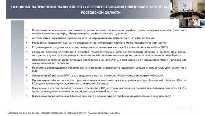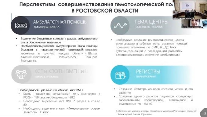 Докладчик рассказала о структуре гематологической службы, маршрутизации пациентов, льготном лекарственном обеспечении пациентов на амбулаторном и стационарном этапах. С 2024 года ведется работа по созданию дорожной карты по льготному лекарственному обеспечению в регионе. Елена Юрьевна озвучила перспективы совершенствования гематологической службы в Ростовской области по направлениям: