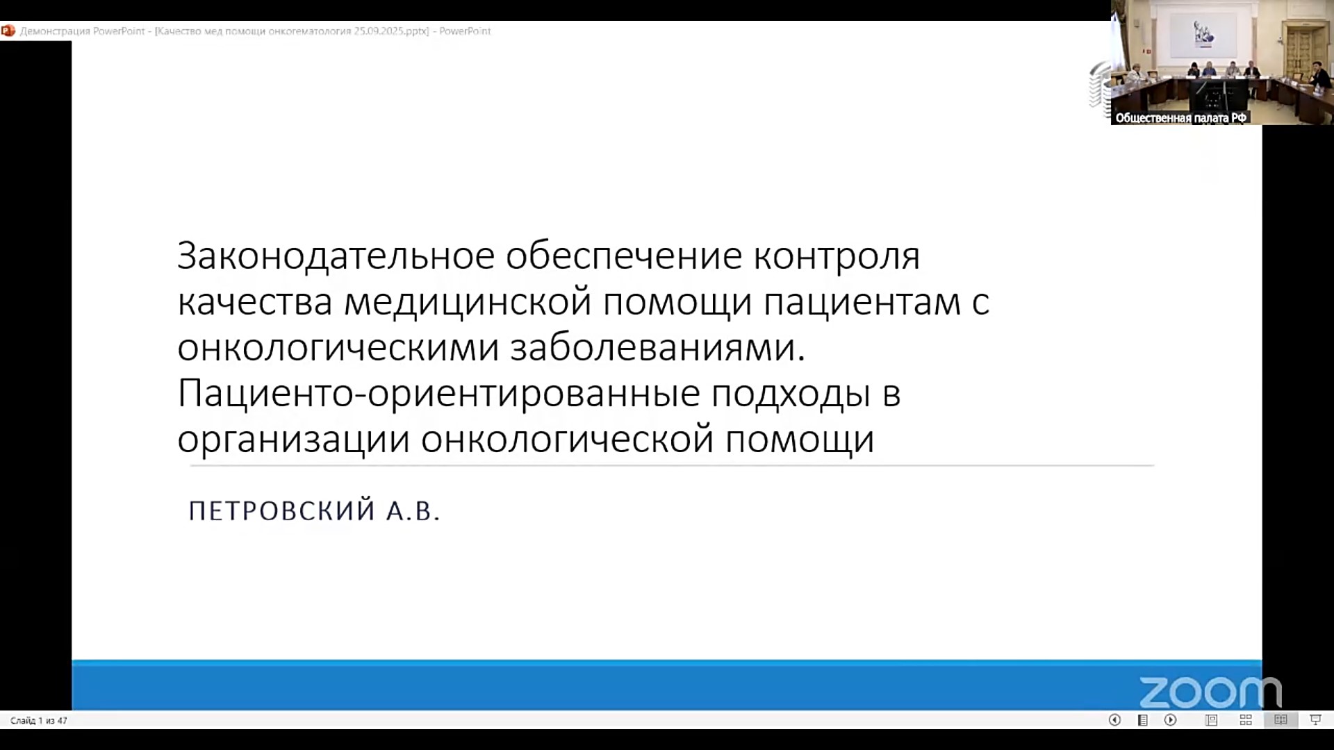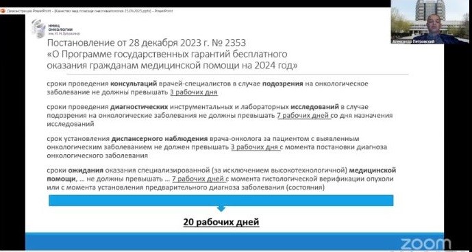 Заместитель директора ФГБУ «НМИЦ онкологии им. Н.Н. Блохина» Минздрава России по научной и образовательной деятельности, заведующий отделом онкомаммологии Александр Валерьевич Петровский, подключившись онлайн, принял участие в работе Форума с докладом «Законодательное обеспечение контроля качества оказания медицинской помощи пациентам с онкологическими заболеваниями. Пациент-ориентированные подходы в организации онкологической помощи».