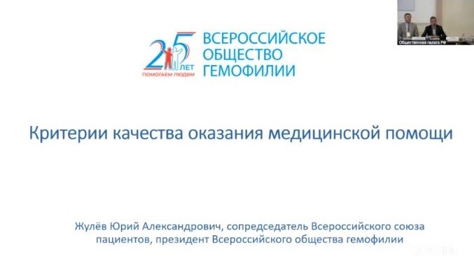 С докладом «Критерии качества оказания медицинской помощи» выступил сопредседатель Всероссийского союза пациентов, президент Всероссийского общества гемофилии Юрий Александрович Жулёв.