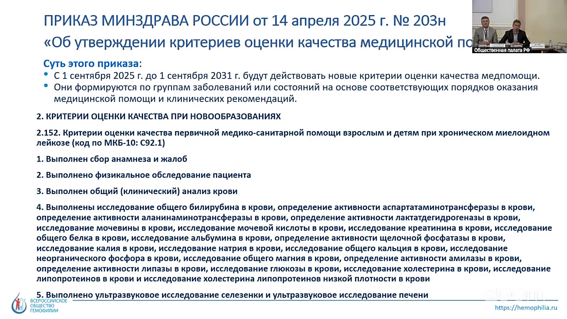 от 21.11.2011 № 323-ФЗ «Об основах охраны здоровья граждан РФ», статья 37. Организация оказания медицинской помощи, статья 64. Экспертиза качества медицинской помощи, статья 79. Обязанности медицинских организаций). Отметил, что с 1 сентября 2025 г. до 1 сентября 2031 г. будут действовать новые критерии оценки качества медпомощи (Приказ Министерства здравоохранения Российской Федерации от 14 апреля 2025 г. № 203н «Об утверждении критериев оценки качества медицинской помощи»). Они формируются по группам заболеваний или состояний на основе соответствующих порядков оказания медицинской помощи и клинических рекомендаций.